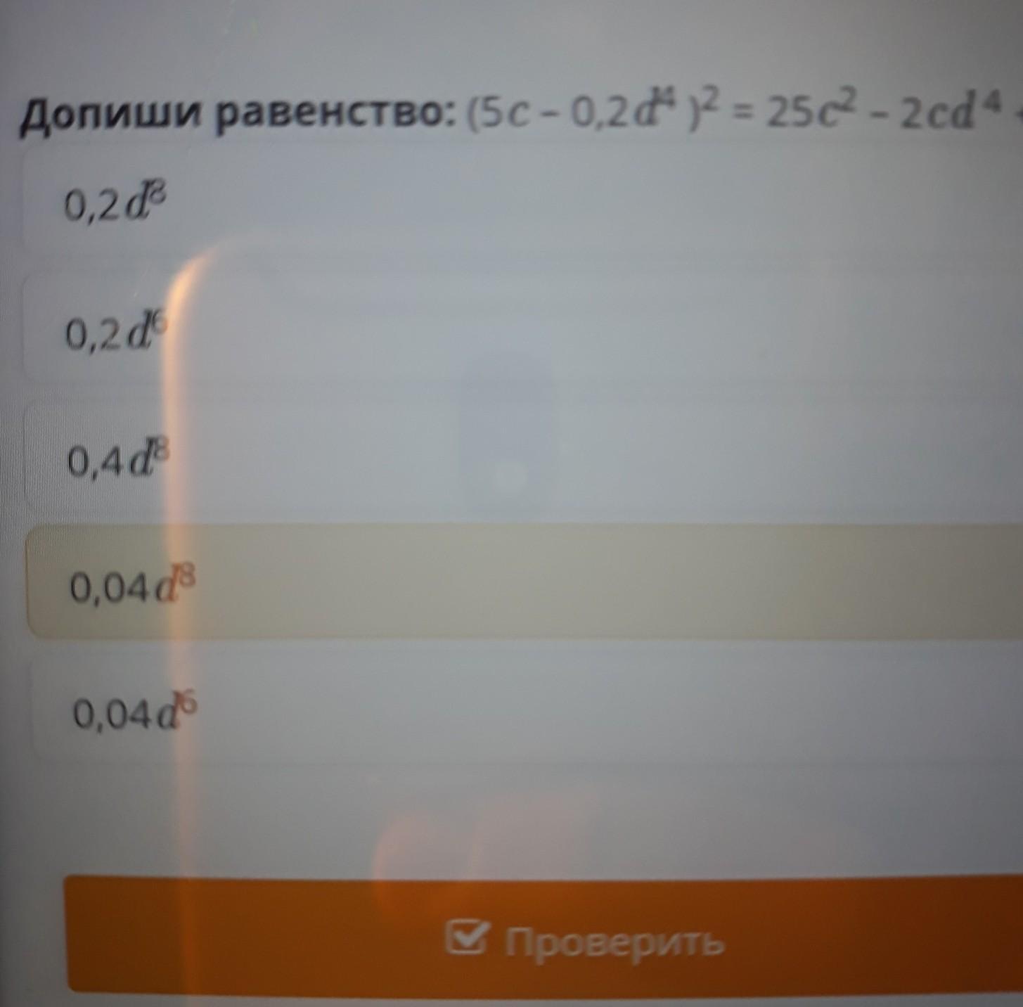 Допиши равенство: (5c - 0,2d4)2 = 25c2 - 2cd4 + ... 0,4d8 0,2d8 0,04 16 0,2d6 0,04d8