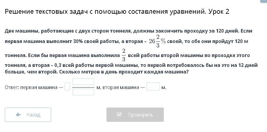 всей работы второй машины по проходке этого тоннеля, а вторая – 0,3 всей работы первой машины, то первой потребовалось бы на это на 12 дней больше, чем второй. Сколько метров в день проходит каждая машина? Помогите пожалуйста по фотографии даю 50 баллов