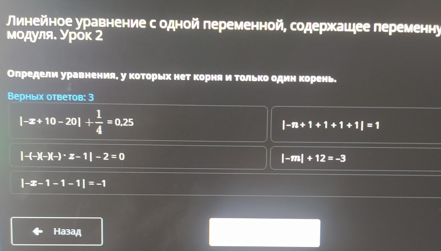 Определи уравнения, у которых нет корня и только один корень. Верных ответов: 3 |-x + 10 - 20| + 1/4 = 0,25 |-(-)(-)(-) • z - 1| - 2 = 0 |-x-1-1-1| = -1 |-n +1+1+1+1| = 1 |-m|+12= -3