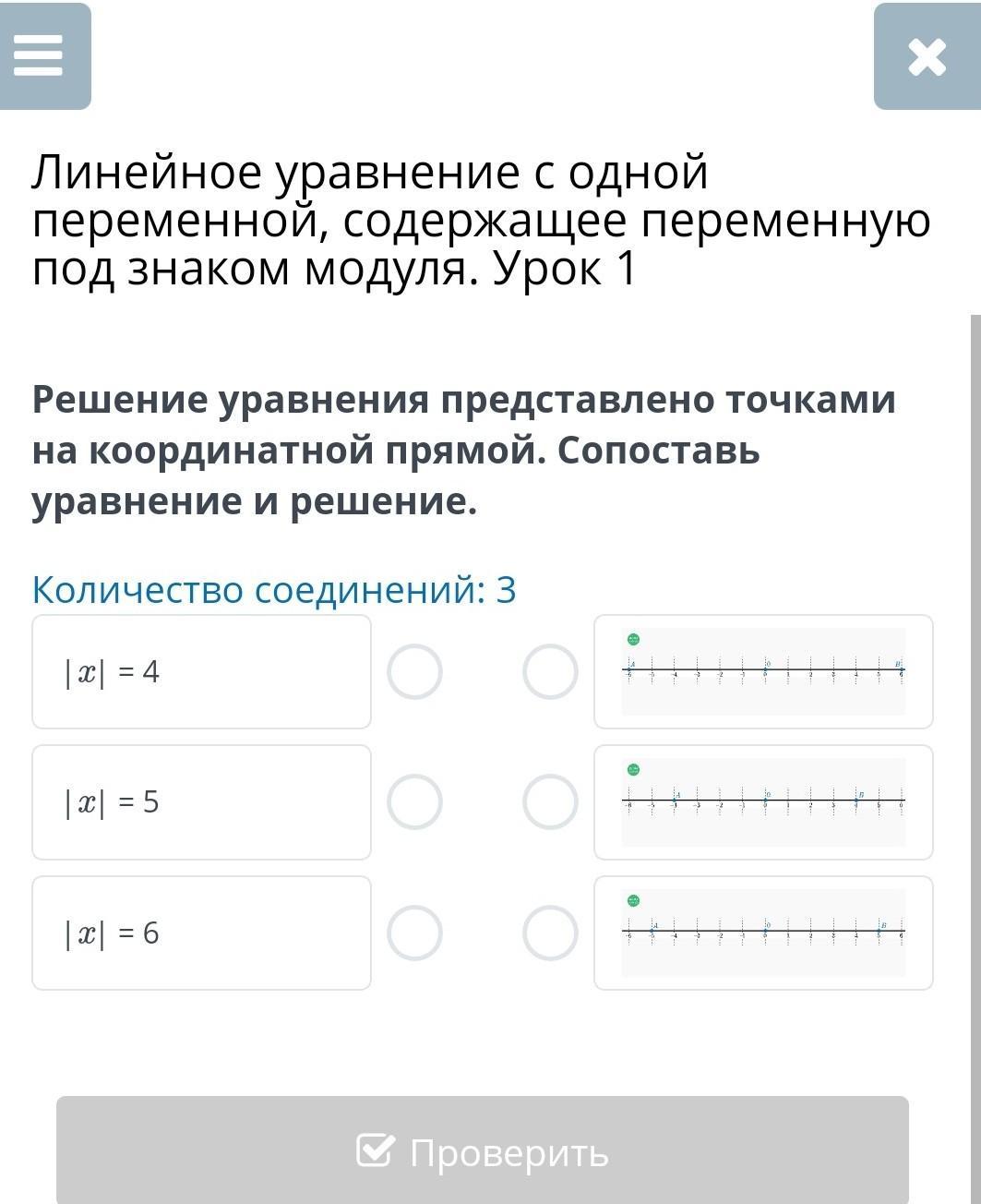Линейное уравнение с одной переменной, содержащее переменную под знаком модуля. Урок 1 Решение уравнения представлено точками на координатной прямой. Сопоставь уравнение и решение. Количество соединений: 3 |x| = 4 |x| = 5 |x| = 6 Назад Проверить
