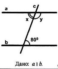 a║b, поэтому ∠х=80° по свойству внутренних накрест лежащих углов; ∠у=180-80=100° по свойству внутренних односторонних углов.