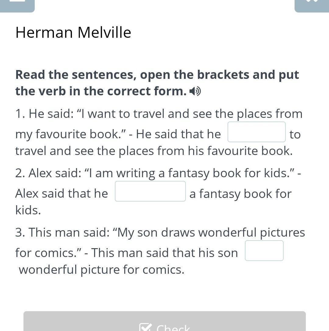 Herman Melville Read the sentences, open the brackets and put the verb in the correct form. 4) 1. He said: "I want to travel and see the places from my favourite book." - He said that he to travel and see the places from his favourite book. 2. Alex said: "I am writing a fantasy book for kids." - Alex said that he kids. a fantasy book for 3. This man said: "My son draws wonderful pictures for comics." - This man said that his son wonderful picture for comics. срочно пжжжжж