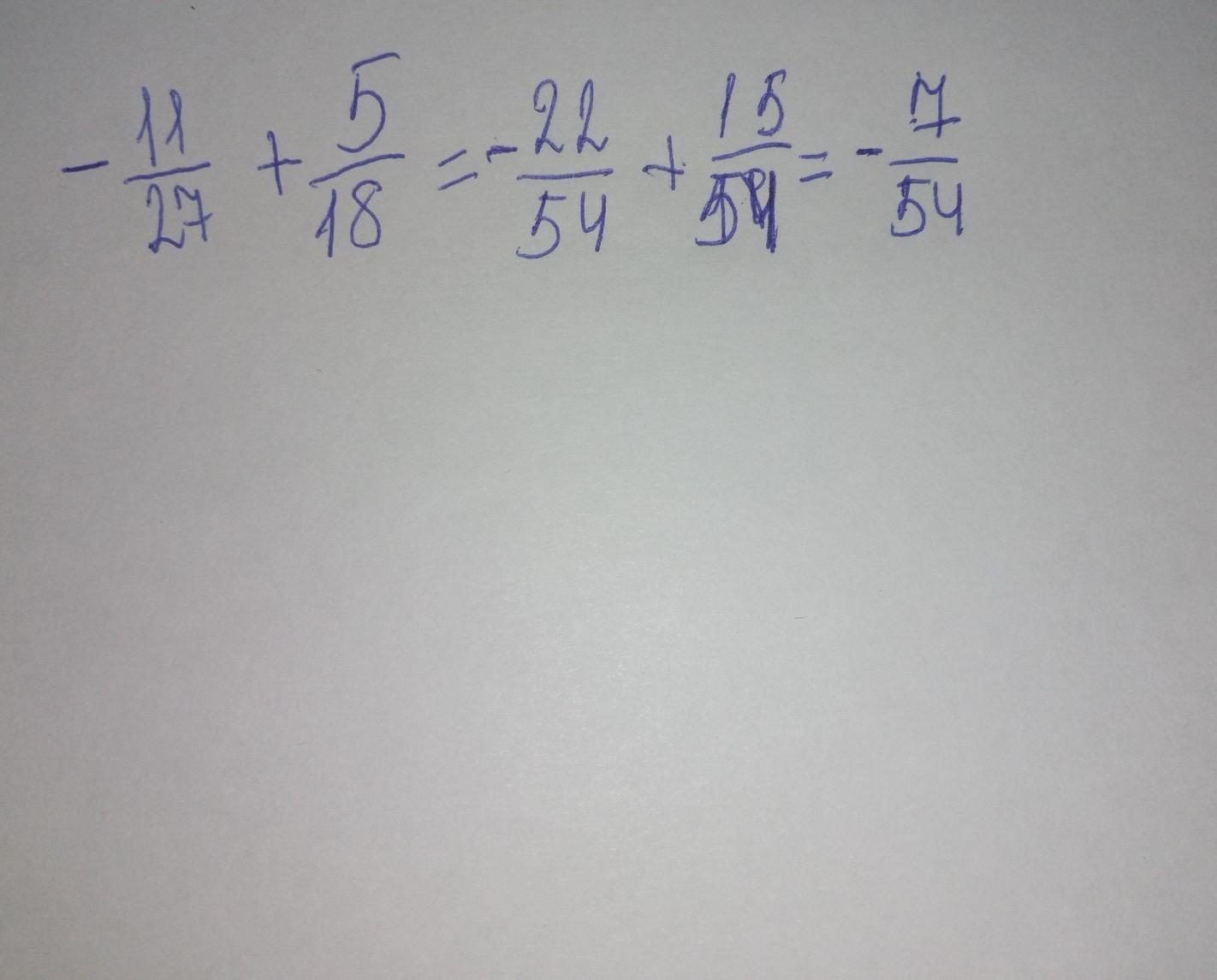 -11/27 + 5/18 = -22/54 + 15/54 = -7/54