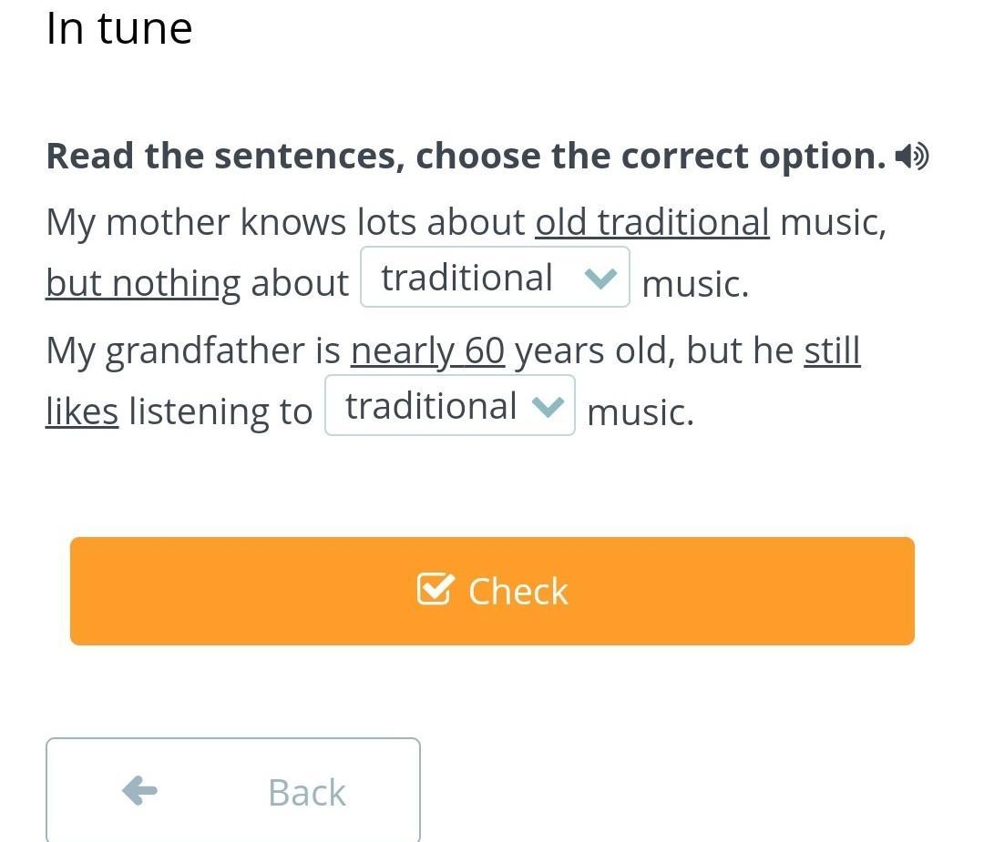 Read the sentences, choose the correct option. My mother knows lots about old music, but nothing about music. My grandfather is nearly 60 years old, but he still likes listening to music