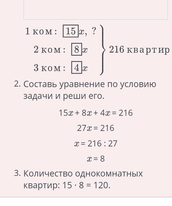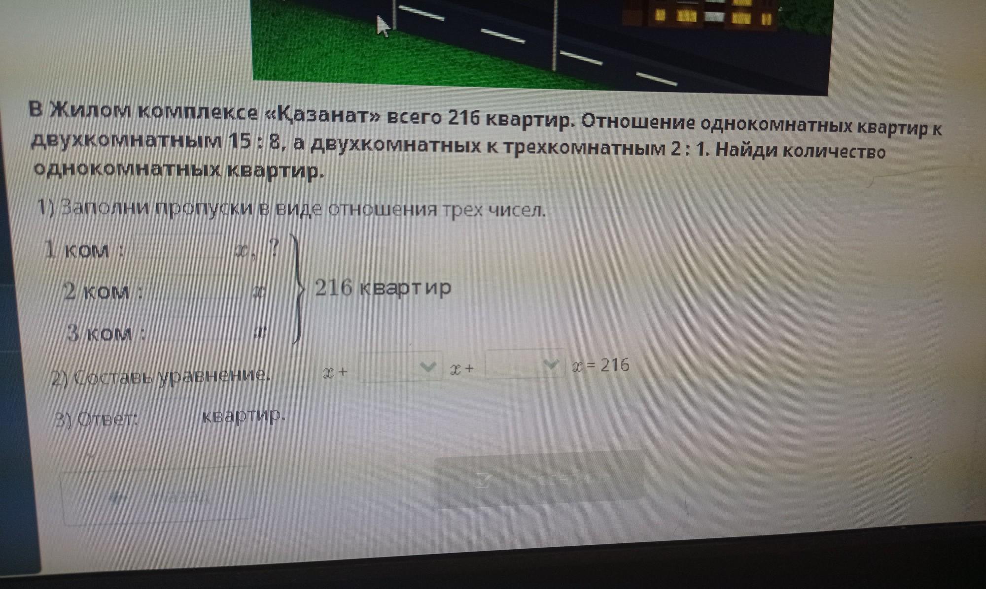 в жилом комплексе «Қазанат» всего 216 квартир. Отношение однокомнатных квартир к двухкомнатным 15 : 8, а двухкомнатных к трехкомнатным 2: 1. Найди количество однокомнатных квартир.
