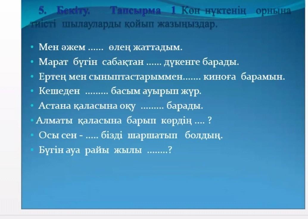 Мен әжем ...... өлең жаттадым. Марат бүтін сабақтан ...... дүкенге барады. Кешеден .......... басым ауырып жур. Астана қаласына оку ......... барады. Ертең мен сыныптастарыммен......... киноға барамын. Бүгін ауа райы жылы ........? Алматы қаласына барып көрдiң .... ? Осы сен ...... бізді шаршатып болдың.