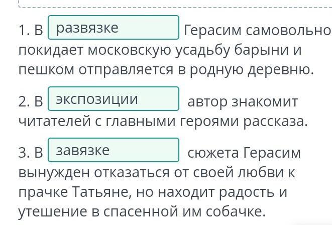 Тургенева «Муму». Распредели в соответствии с событиями рассказа элементы композиции, выбрав их из выпадающего списка. - Вообще Герасим был нрава строгого и серьезного, любил во всем порядок; даже петухи при нем не смели драться, — а то беда! Увидит, тотчас схватит за ноги, повертит раз десять на воздухе колесом и бросит врозь. На дворе у барыни водились тоже гуси; но гусь, известно, Птица важная и рассудительная; Герасим чувствовал к ним уважение, ходил за ними и кормил их; он сам смахивал на степенного гусака. Ему отвели над кухней каморку; он устроил ее себе сам, по своему вкусу, соорудил в ней кровать из дубовых досок на четырех чурбанах, – истинно богатырскую кровать; сто пудов можно было положить на нее – не погнулась бы; под кроватью находился дюжий сундук; в уголку стоял столик такого же крепкого свойства, а возле столика – стул на трех ножках, да такой прочный и приземистый, что сам Герасим, бывало, поднимет его, уронит и ухмыльнется. Каморка запиралась на замок, напоминавший своим видом калач, только черный; ключ от этого замка Герасим всегда носил с собой на пояске. Он не любил, Чтобы к нему ходили. Х A C Герасим самовольно покидает московскую усадьбу барыни и пешком отправляется в 1. В родную деревню. 2. В автор знакомит читателей с главными героями рассказа. 3. В сюжета Герасим вынужден отказаться от своей любви к прачке Татьяне, но находит радость и утешение в спасенной им собачке.