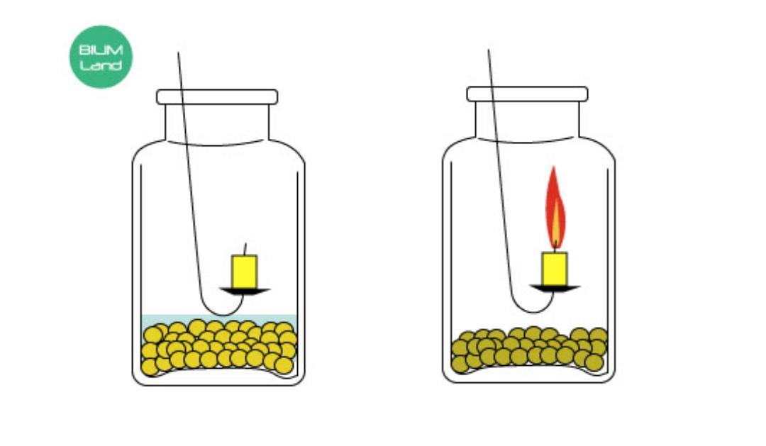 В две стеклянные банки положили сухие семена гороха. В первую налили немного воды, а вторую оставили без изменений. Через сутки поместили в банки горящую свечу. В первой банке свеча потухла, а во второй продолжила гореть.