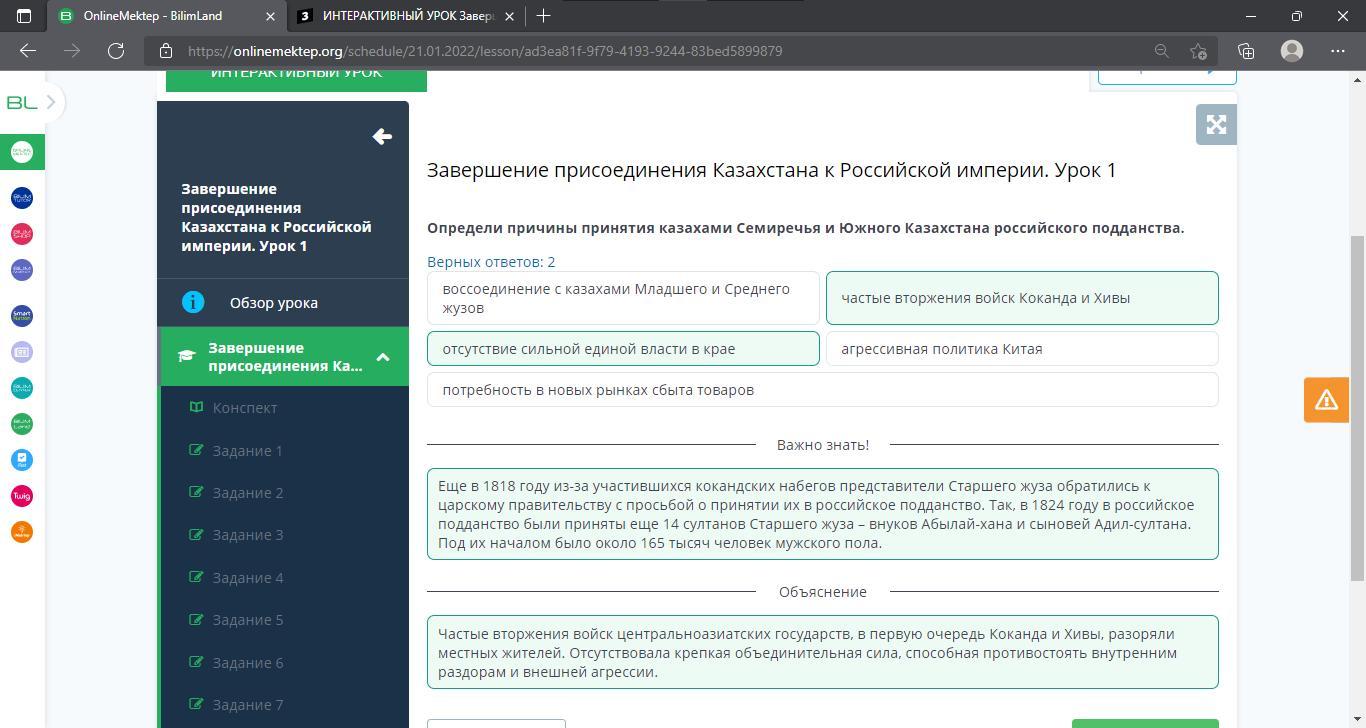 ИНТЕРАКТИВНЫЙ УРОК Завершение присоединения Казахстана к Российской империи. Урок 1 Определи причины принятия казахами Семиречья и Южного Казахстана российского подданства. Верных ответов: 2 агрессивная политика Китая частые вторжения войск Коканда и Хивы воссоединен Среднего жу: потребность в новых рынках сбыта товаров отсутствие сильной единой власти в крае