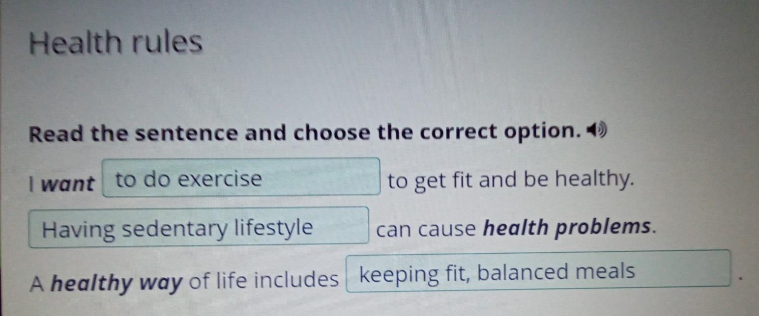 Health rules Read the sentence and choose the correct option. I want to get fit and be healthy. can cause health problems. A healthy way of life includes