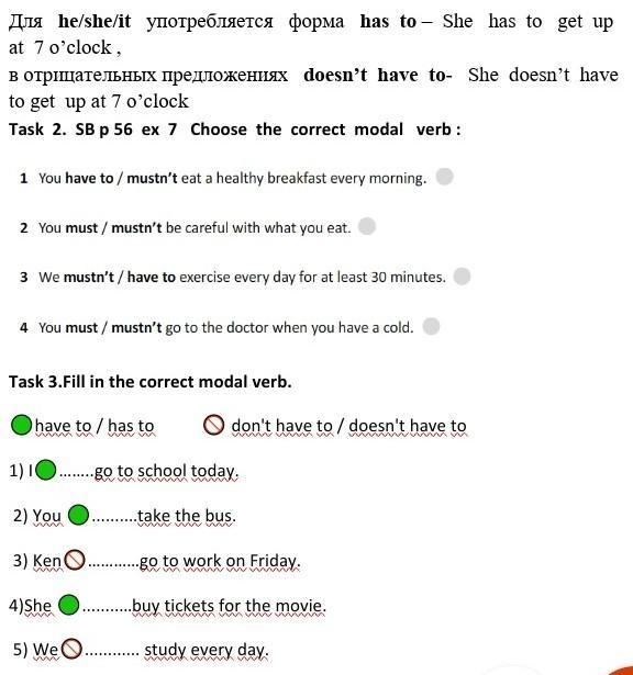 Task 3. 1) I *have to* go to school today. 2) You *have to* take the bus. 3) Ken *doesn't have to* go to work on Friday 4) She *has to* buy tickets for the movie. 5) We *don't have to* study every day.