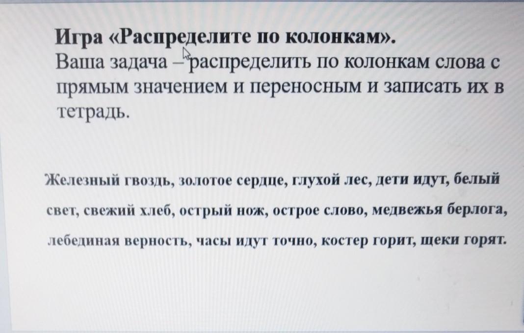 Прямое значение:железный гвоздь,дети идут,свежий хлеб,острый нож,медвежья берлога,костер горит.