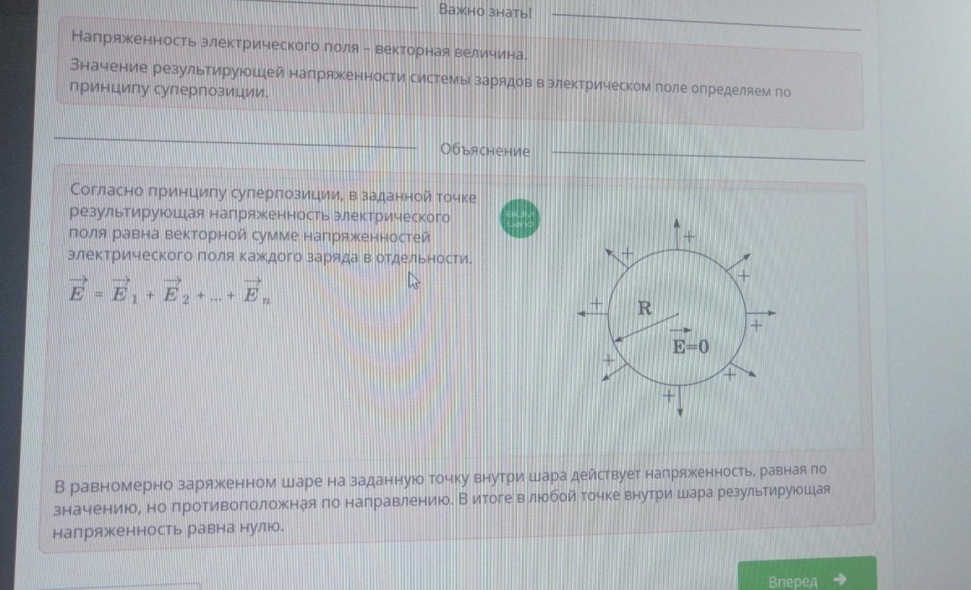 Каково направление вектора напряженности электрического поля в точке N, расположенного внутри равномерно заряженного шара?