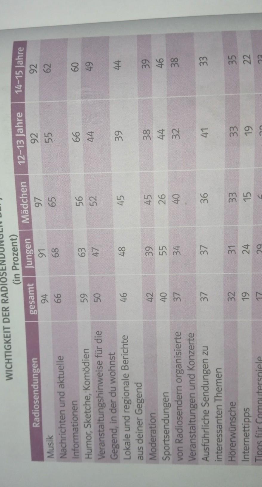 1)Welche Sendungen hören Jugendliche / Mädchen / Jungen am liebsten? 2)Was gefällt den 12-13-jährigen / 14-15-jährigen Jugendlichen am meisten / am wenigsten?