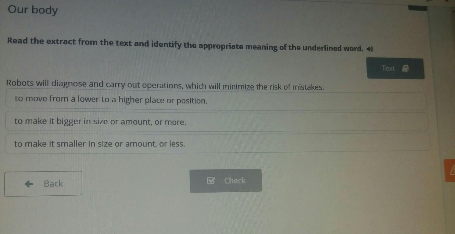 Our body Read the extract from the text and identify the appropriate meaning of the underlined word. Text Robots will diagnose and carry out operations, which will minimize the risk of mistakes. to move from a lower to a higher place or position. to make it bigger in size or amount, or more. to make it smaller in size or amount, or less. Back Check Å