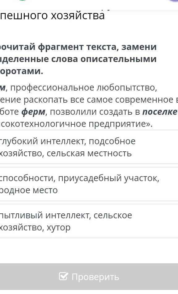 Прочитай Фрагмент текста, замени выделенные слова описательными оборотами. «Ум, профессиональное любопытство, умение раскопать все самое современное в работе ферм, позволили создать в поселке высокотехнологичное предприятие». глубокий интеллект, подсобное хозяйство, сельская местность способности, приусадебный участок, родное место пытливый интеллект, сельское хозяйство, хутор