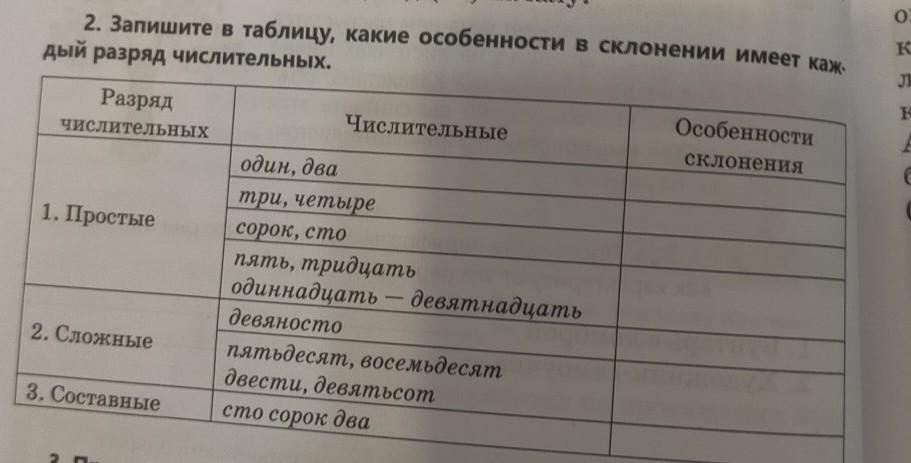 2. Запишите в таблицу, какие особенности в склонении имеет как дый разряд числительных. Разряд числительных Числительные Особенности склонения она одним кое сияние лую луну. ким серпи Абай нево была как (По М. А. один, два 1. Простые 5. Сост - три, четыре сорок, сто пять, тридцать одиннадцать - девятнадцать девяносто пятьдесят, восемьдесят двести, девятьсот сто сорок два 2. Сложные 3. Составные