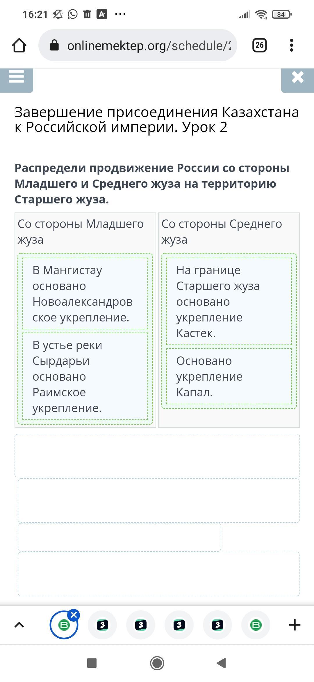 х Завершение присоединения Казахстана к Российской империи. Урок 2 Распредели продвижение России со стороны Младшего и среднего жуза на территорию Старшего жуза. Со стороны Младшего жуза Со стороны Среднего жуза D на ВМангистау основано Новоалександровское укрепление. На границе Старшего жуза основано укрепление Кастек. - Основано укрепление Капал. В устье реки Сырдарьи основано Раимское укрепление. Назад