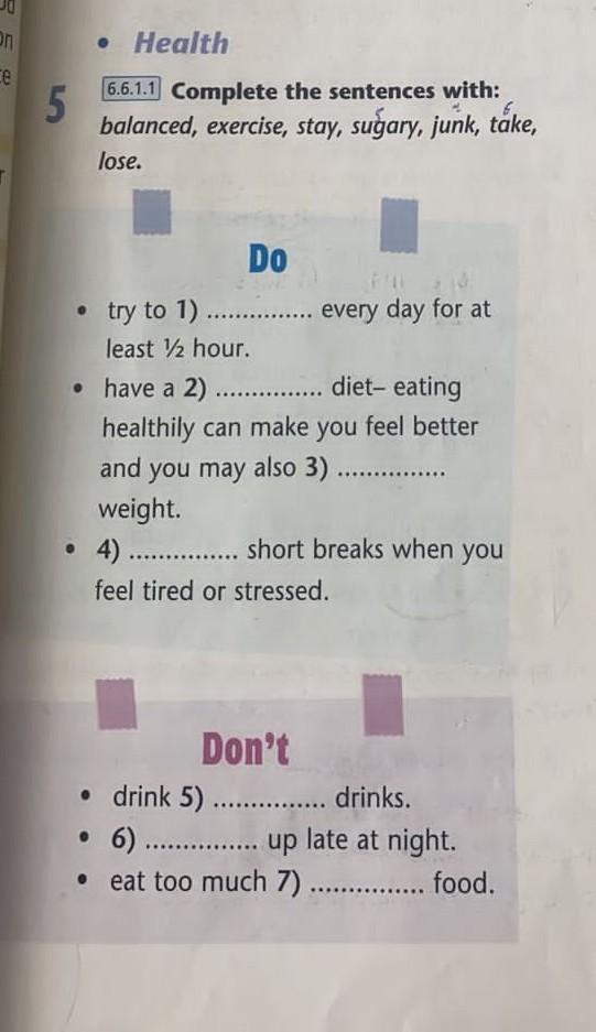 1exersice,2balanced,3lose,4take5sugary6stay7junk