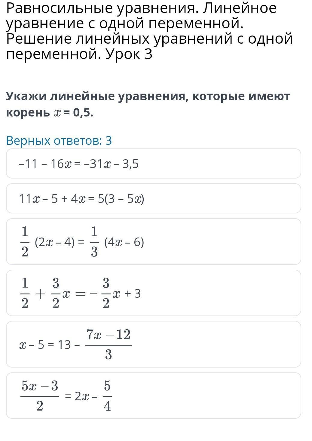 укажи линейное уравнение которое имеет корень X равно 0,5