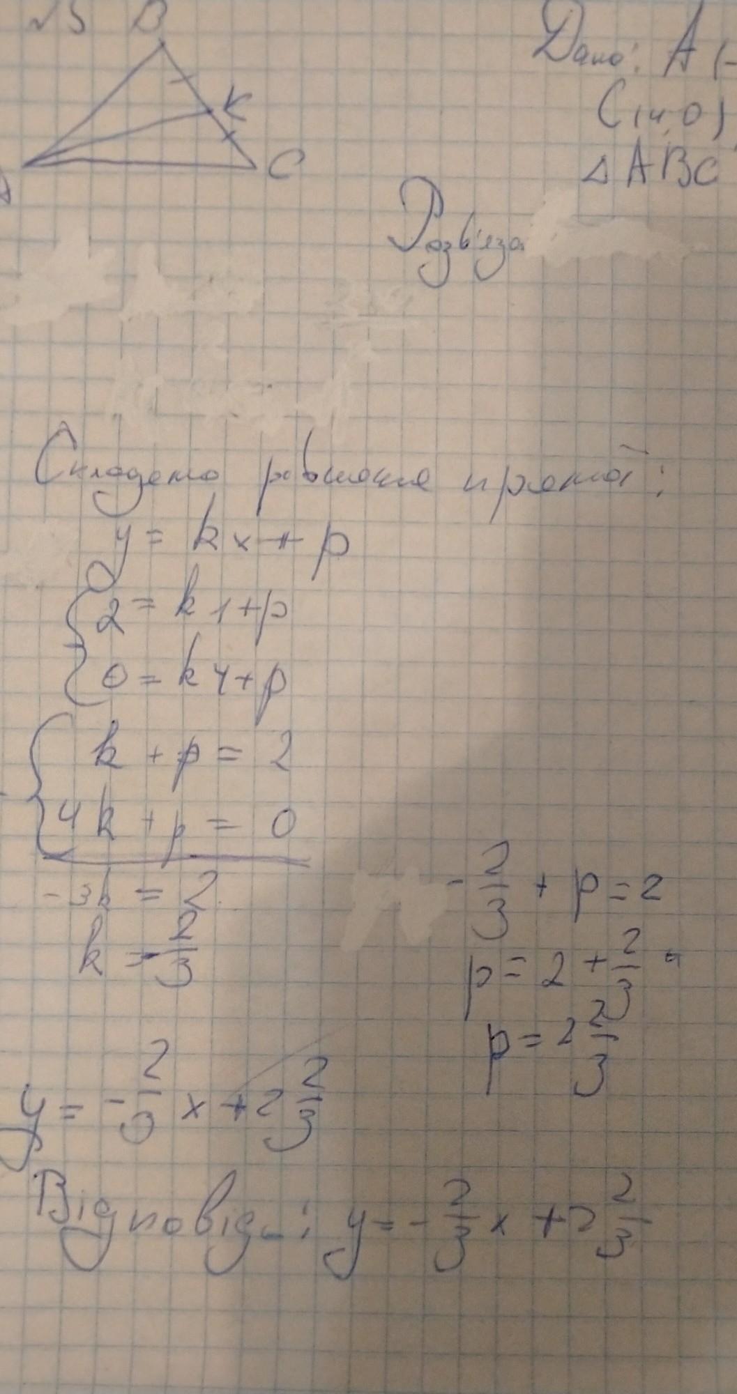 У трикутнику ABC складіть рівняння медіани АК, якщо А (- 6; 4), В (1; 2), C (4;0)