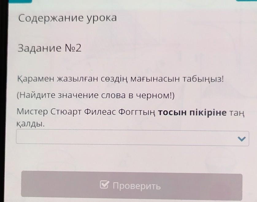 Задание No 2 Қарамен жазылған сөздің мағынасын табыңыз! Мистер Стюарт Филеас Фоггтың тосын пікіріне таң қалды. 8 Проверить