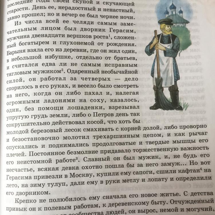 Герасим - бесправный крепостной крестьянин. Он страдает немотой, но такой недостаток не мешает его работе. Герасим неприхотлив и очень одинок. Пока он был в деревне, он с легкостью выполнял любую тяжелую работу: обрабатывал землю, собирал урожай. А когда пришлось переехать в город и взять метлу и лопату, чтобы выполнять обязанности дворника, он стал тосковать.