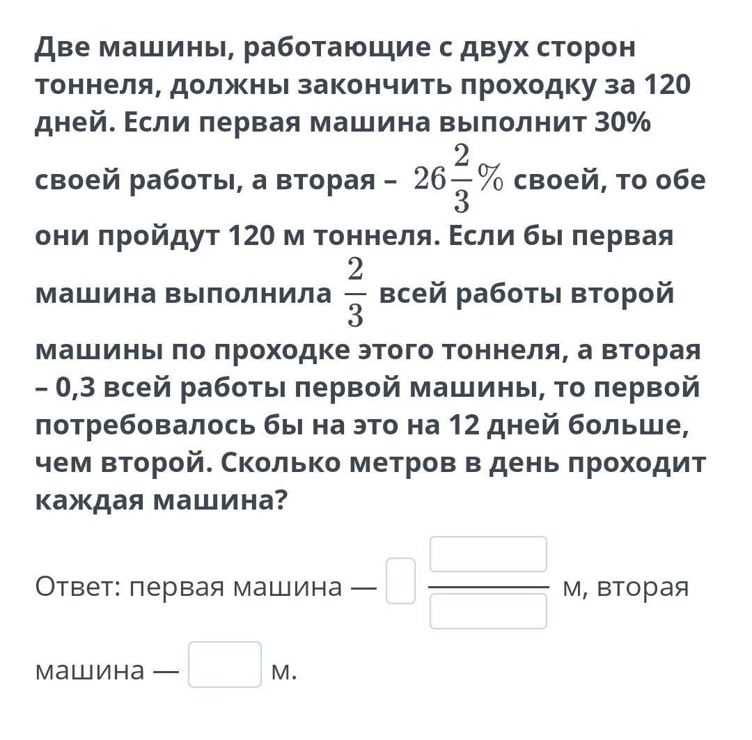 Две машины, работающие с двух сторон тоннеля, должны закончить проходку за 120 дней. Если первая машина выполнит 30% своей работы, а вторая – своей, то обе они пройдут 120 м тоннеля. Если бы первая машина выполнила всей работы второй машины по проходке этого тоннеля, а вторая – 0,3 всей работы первой машины, то первой потребовалось бы на это на 12 дней больше, чем второй. Сколько метров в день проходит каждая машина? Срочно нужно, помогите 30 балов даю