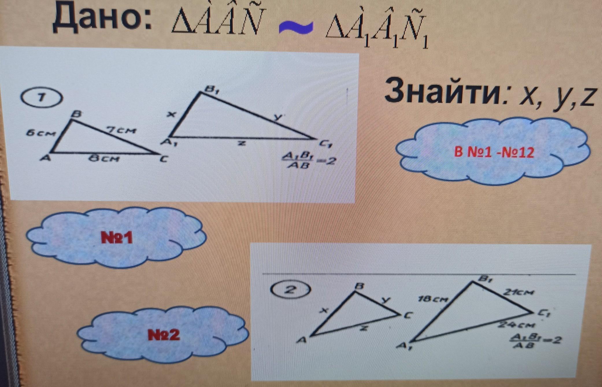 тогда 1) х=12 см, у=14 см, z=16 см, 2) х=9 см, у=10,5 см, z=12 см