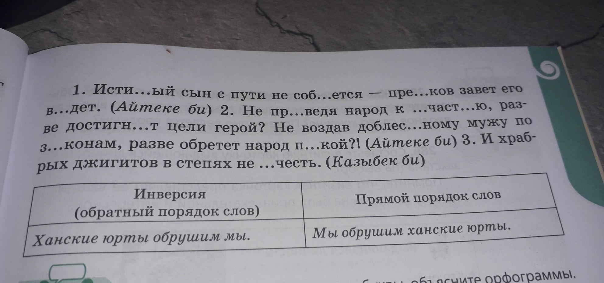 1. Исти...ый сын с пути не соб...ется пре...ков завет его в...дет. (Айтеке би) 2. Не пр...ведя народ к ...част...ю, раз- ве достигн...т цели герой? Не воздав доблес...ному мужу по 3...конам, разве обретет народ п...кой?! (Айтеке би) 3. И храб- рых джигитов в степях не ...честь. (Казыбек би) Прямой порядок слов Инверсия (обратный порядок слов) Ханские юрты обрушим мы. Мы обрушим ханские юрты. псиите орфограммы.