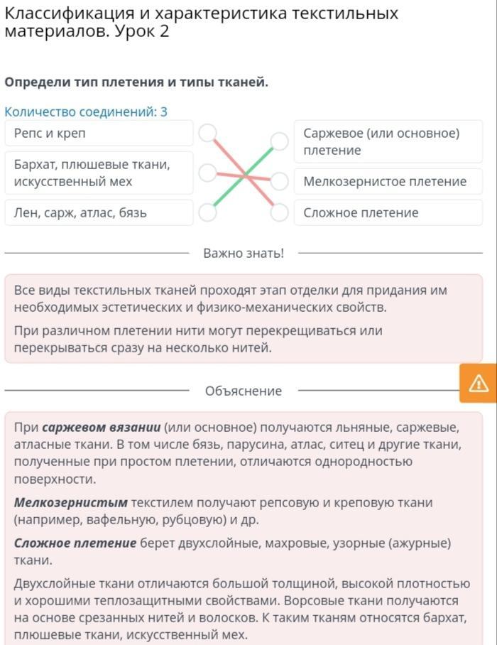 Классификация и характеристика текстильных материалов. Урок 2 Определи тип плетения и типы тканей. Количество соединений: 3 Репс и креп Саржевое (или основное) плетение Бархат, плюшевые ткани, искусственный мех Мелкозернистое плетение Сложное плетение Лен, сарж, атлас, бязь