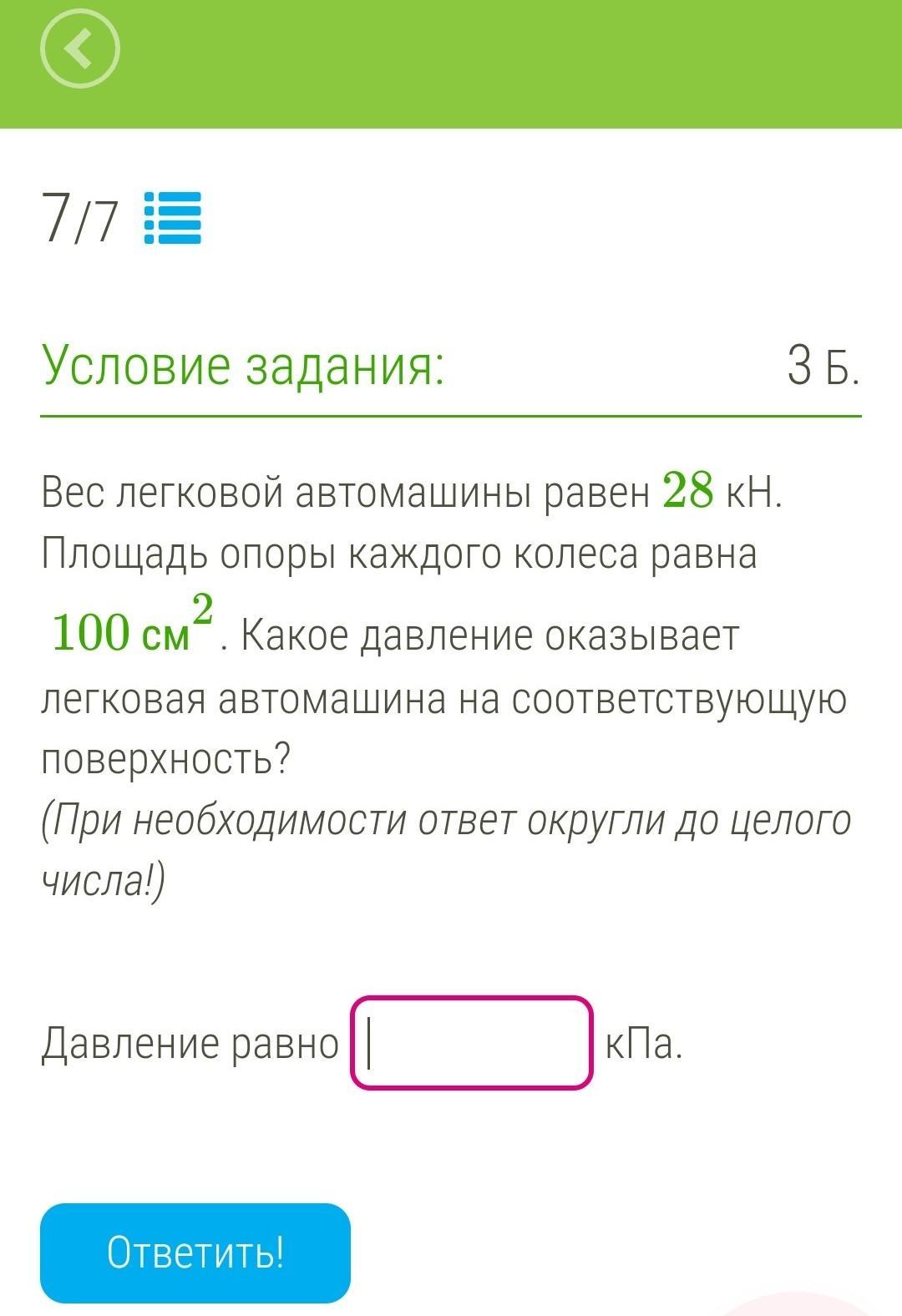 Объяснение:p=F/S=F/4S= 28000H/ 4*0,01 м²=700000Па