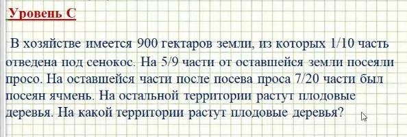 В хозяйстве имеется 900 гектаров земли, из которых 1/10 часть отведена под сенокос. На 5/9 части от оставшейся земли посеяли просо. На оставшейся части после посева проса 7/20 части был посеян ячмень. На остальной территории растут плодовые деревья. На какой территории растут плодовые деревья?