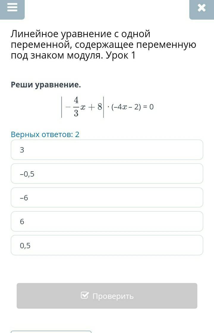 Линейное уравнение с одной переменной, содержащее переменную под знаком модуля. Урок 1 Реши уравнение. ∙ (–4x – 2) = 0 Верных ответов: 2 3 –0,5 –6 6 0,5 Назад Проверить