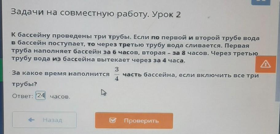 задачи на совместную работу урок 2 к бассейну проведены 3 трубы если по 1 и 2 трубе вода в бассейн поступает то через третью трубу вода сливается Первая труба наполняет бассейн за 6 часов вторая за 8 часов через третью трубу вода из бассейна вытекает через 4 часа За какое время наполнится 34 часть бассейна если включить все три трубы пжжжжжжжжжжжжжжжжжжжжжжжжжжжжжжжээээ