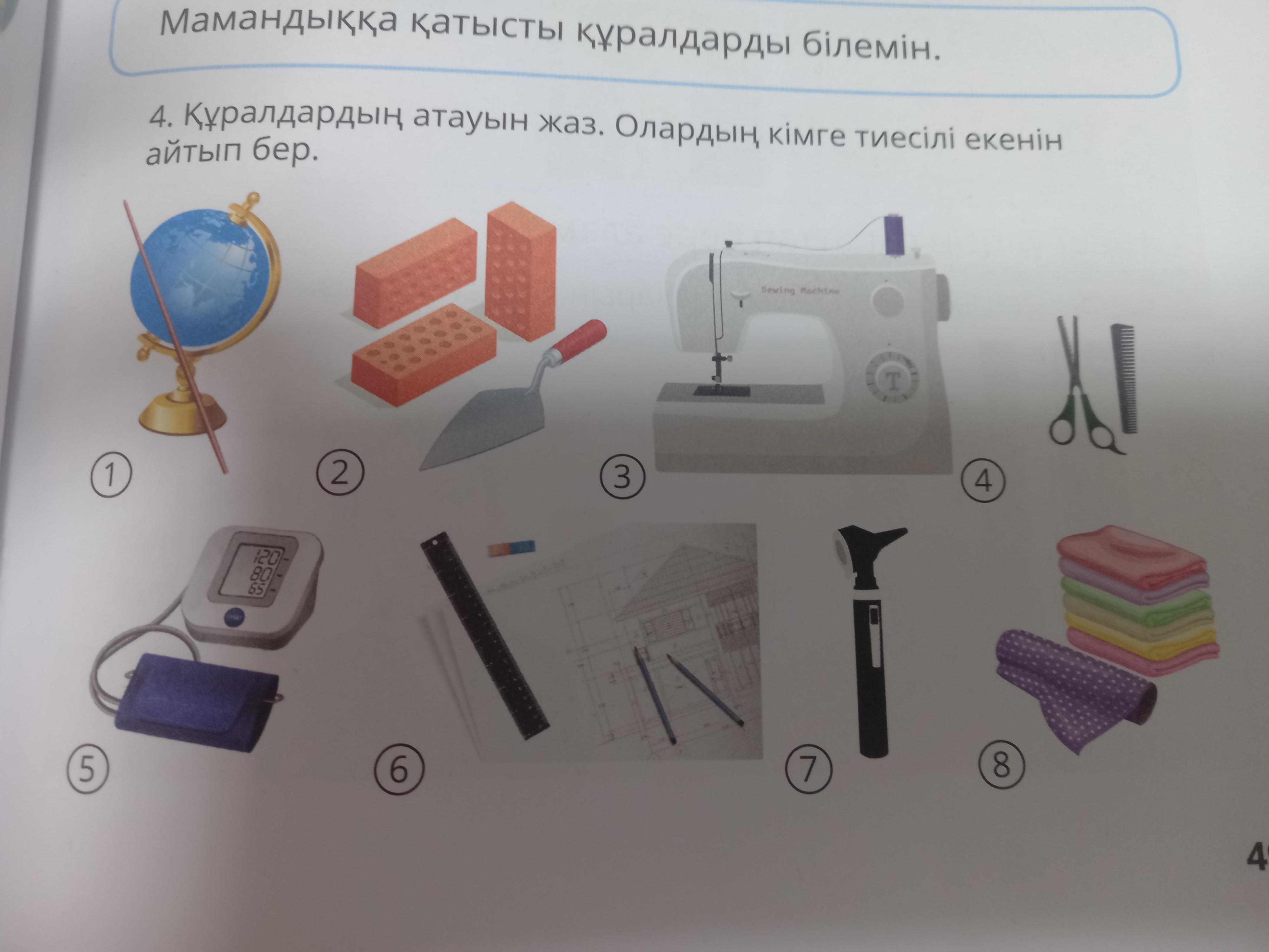 1)глобус 2)кірпіш 3)тігін машинесі 4)қайшы мен тарақ 5)температураны тексеретін 6)үйдің модельі 7) білмейм 8)мата