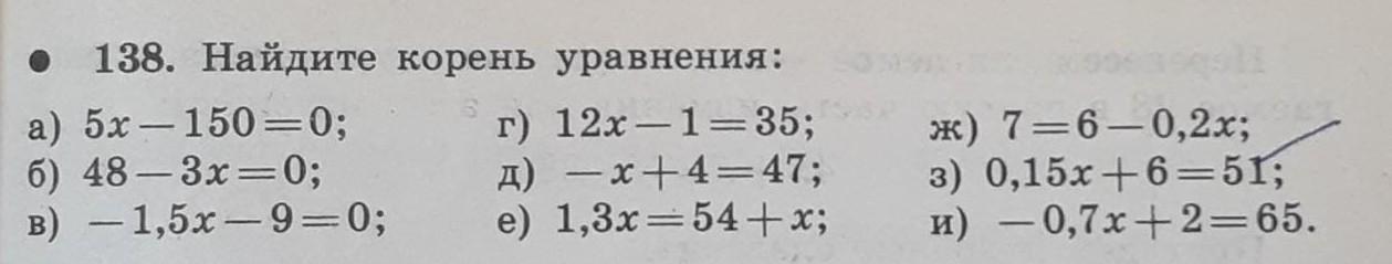 138. Найдите корень уравнения: а) 5x - 150 = 0; г) 12х – 1 = 35; 6) 48 - 3x=0; 1) — х+4= 47; в) - 1,5х — 9 = 0; е) 1,3x = 54 + x; 2 ж) 7 = 6 — 0,2х; 3) 0,15х + 6 = 5; и) — 0,7х+2= 65. -. СРОЧНО ДАМ 30 Б
