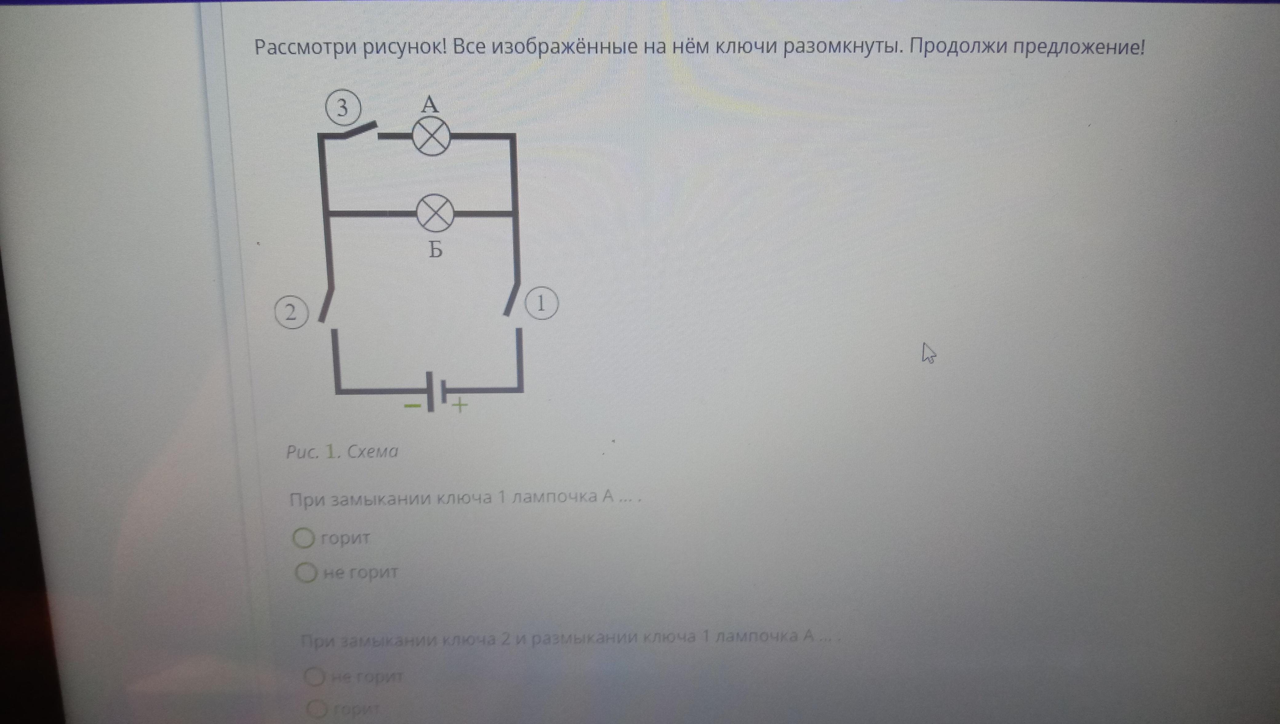 - А горит, поскольку ключи 1 и 2 замыкают малую цепь и через нее течет ток