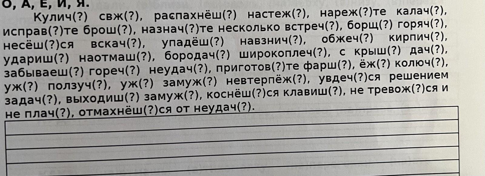 ударишь, наотмашь,бородач,шикороплечь,с крыш,дач,забываешь,горечь,неудач,приготовьте фарш,ёж колюч,уж ползуч,уж, замуж,невтерпёж,увлечься решением задач,выходишь замуж,коснёшься клавиш,не тревожься и не плачь,отмахнешься от неудач.