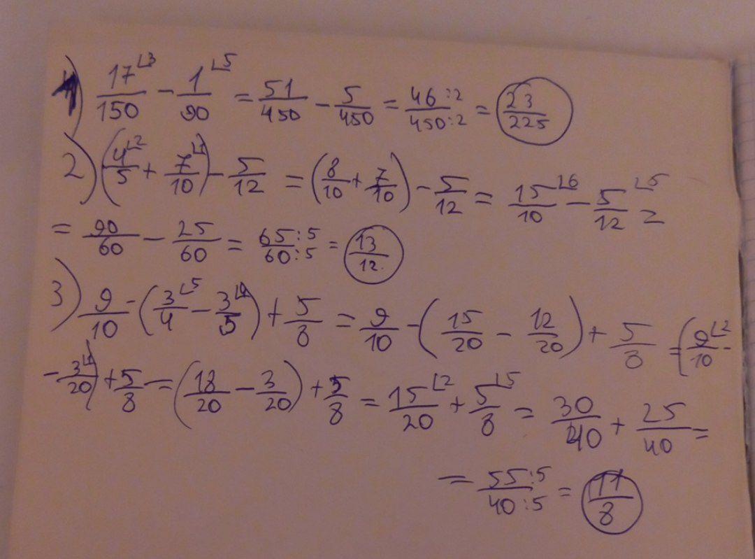 4) 17/150 - 1/90; 4/5 + 7/10 - 5/12; 6) 9/10 - (3/4 - 3/5) + 5/8