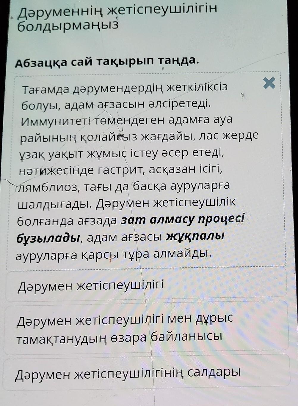Дәруменнің жетіспеушілігін болдырмаңыз Абзацқа сай тақырып таңда. Тағамда дәрумендердің жеткіліксіз болуы, адам ағзасын әлсіретеді. Иммунитеті төмендеген адамға ауа райының қолайсыз жағдайы, лас жерде ұзақ уақыт жұмыс істеу әсер етеді, нәтижесінде гастрит, асқазан ісігі, Лямблиоз, тағы да басқа ауруларға шалдығады. Дәрумен жетіспеушілік болғанда ағзада зат алмасу процесі бұзылады, адам ағзасы жұқпалы ауруларға қарсы тұра алмайды. Дәрумен жетіспеушілігі Дәрумен жетіспеушілігі мен дұрыс тамақтанудың өзара байланысы Дәрумен жетіспеушілігінің салдары