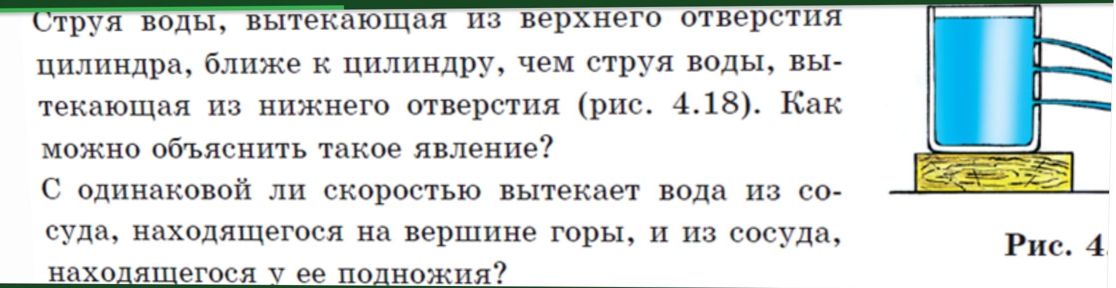В первом случае высота столба жидкости над отверстием меньше чем во втором случае, поэтому давление меньше( давление в жидкостях передается одинаково во всех направлениях !на одинаковой глубине!), и жидкость вытекает с меньшей скоростью, следовательно и уровень наклона больше.