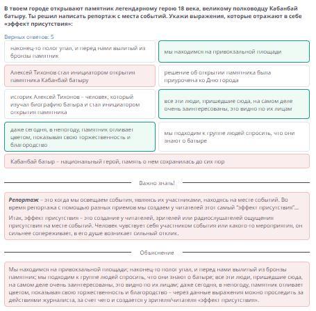 Главная Расписание Выдающиеся личности Казахстана. Репортаж. Дефис в наречиях OnlineMektepРасписаниеДомашние заданияСвязь с учителемДневникРейтинг учениковРепетиторыBilimShopBilimMarketГосуслугиНовости BilimCenterBilimLandiTestTwig-BilimiMektep Выдающиеся личности Казахстана. Репортаж. Дефис в наречиях 21 ЯНВАРЯ РУССКИЙ ЯЗЫКЭБЕЛЬ Л ИНТЕРАКТИВНЫЙ УРОК Открыть чат Выдающие личности Казахстана. Репортаж. Дефис в наречиях В твоем городе открывают памятник легендарному герою 18 века, великому полководцу Кабанбай батыру. Ты решил написать репортаж с места событий. Укажи выражения, которые отражают в себе «эффект присутствия»: Верных ответов: 5 мы находимся на привокзальной площади все эти люди, пришедшие сюда, на самом деле очень заинтересованы, это видно по их лицам Алексей Тихонов стал инициатором открытия памятника Кабанбай батыру мы подходим к группе людей спросить, что они знают о батыре решение об открытии памятника была приурочена ко Дню города даже сегодня, в непогоду, памятник отливает цветом, показывая свою торжественность и благородство наконец-то полог упал, и перед нами вылитый из бронзы памятник историк Алексей Тихонов – человек, который изучал биографию батыра и стал инициатором открытия памятника Кабанбай батыр – национальный герой, память о нем сохранилась до сих пор Назад Проверить