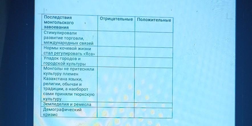 Отрицательные Положительные Последствия Монгольского завоевания Стимулировали развитие торговли, международных связей Нормы кочевой жизни стал регулировать «Яса» Упадок городов и городской культуры Монголы не притесняли культуру племен Казахстана языки, религии, обычаи и традиции, а наоборот сами приняли тюркскую культуру Земледелия и ремесла Демографический кризис