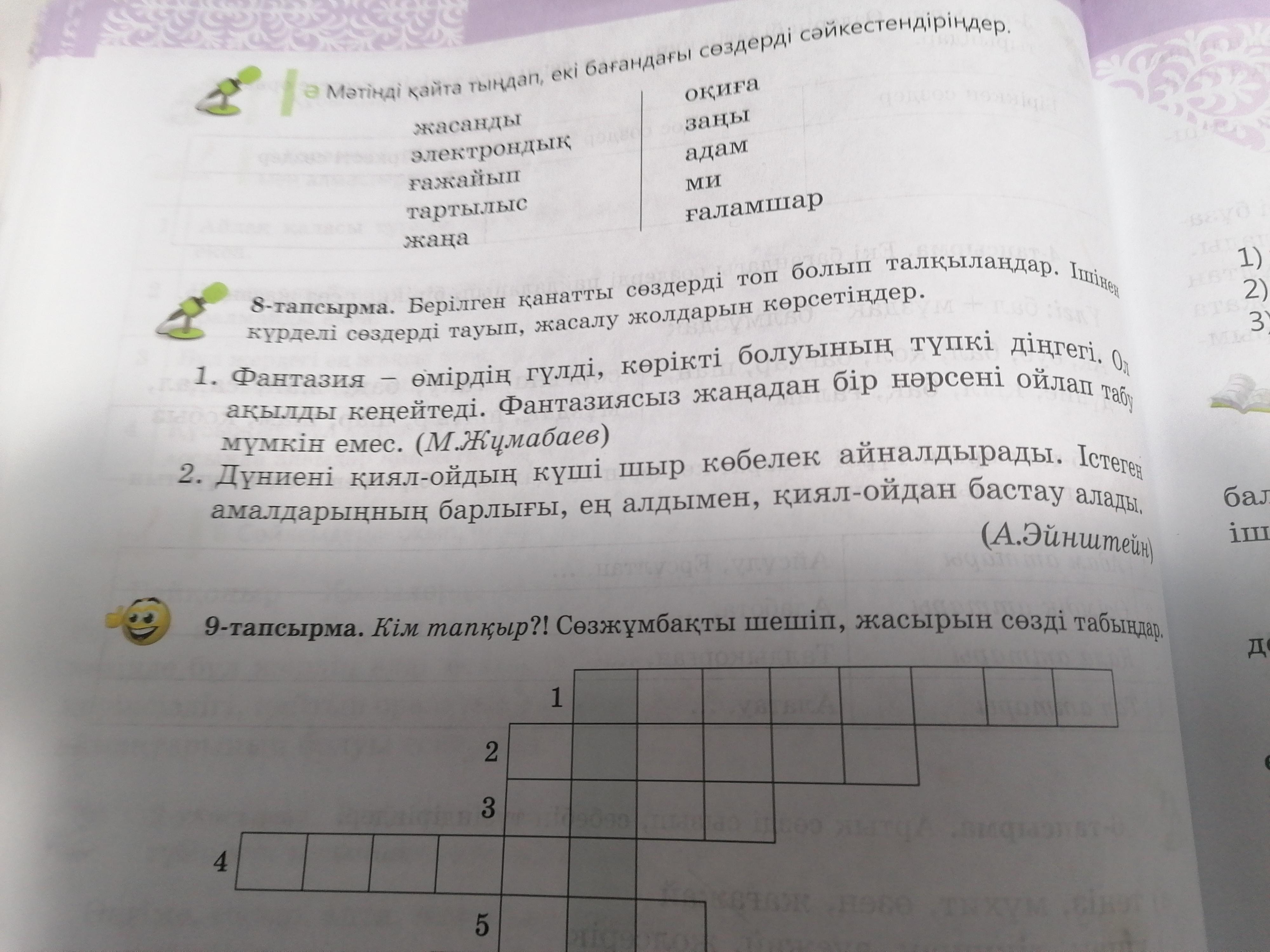 8 тапсырма берілген қанатты сөздерді топ болып талқылаңдар. Ішінен күрделі сөз тауып, жасалу жолдарын көрсетеіндер
