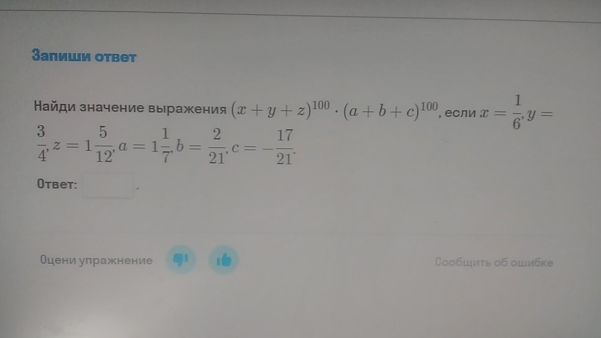 (x+y+z)¹⁰⁰=7/3¹⁰⁰ , (a+b+c)¹⁰⁰=3/7¹⁰⁰, 7/3¹⁰⁰·3/7¹⁰⁰=1
