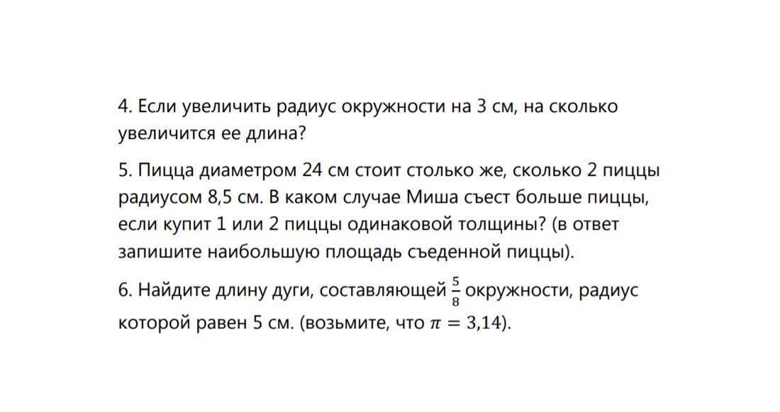 4. была длина 2πR стала 2π(R+3)= 2πR+6π, увеличится на 6π,