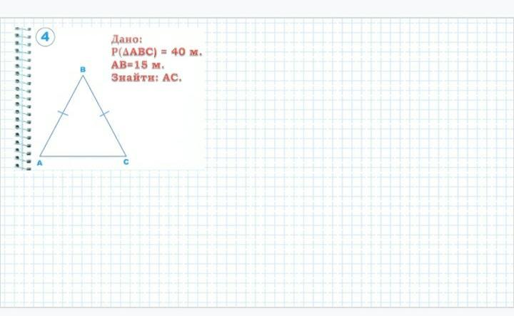 2)т.к. АВ=ВС то треугольник АВС-равнобедренный, отсюда следует, что АС=40-15-15=10м