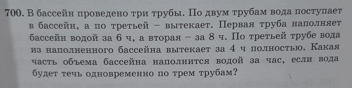 можно сразу условие и решение задачи пожалуйста. 700. В бассейн проведено три трубы. По двум трубам вода поступает в бассейн, а по третьей вытекает. Первая труба наполняет бассейн водой за 6 ч, а вторая – за 8 ч. По третьей трубе вода из наполненного бассейна вытекает за 4 ч полностью. Какая часть объема бассейна наполнится водой за час, если вода будет течь одновременно по трем трубам?