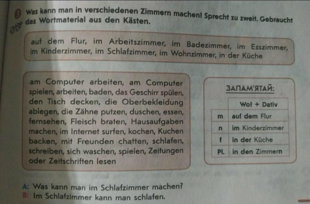Im Kinderzimmer kann man Hausaufgaben machen/ schlafen/ schreiben/ am Computer spielen